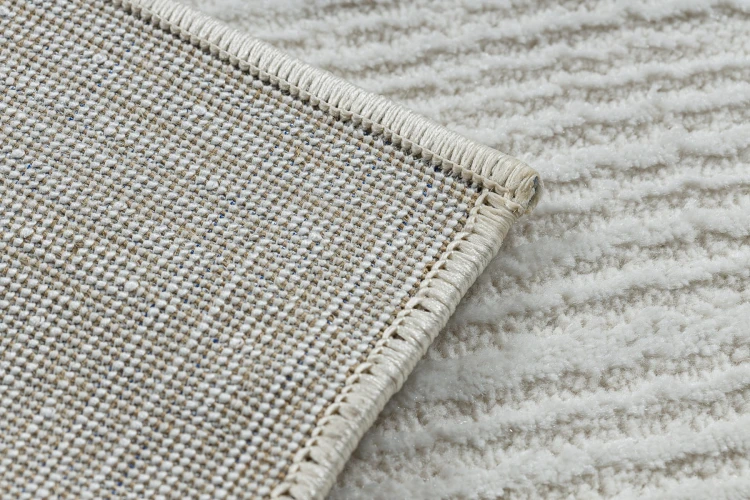 Kremowy dywan z geometrycznym wzorem abstrakcyjnym, który doskonale wpisze się w nowoczesny salon lub pokój.