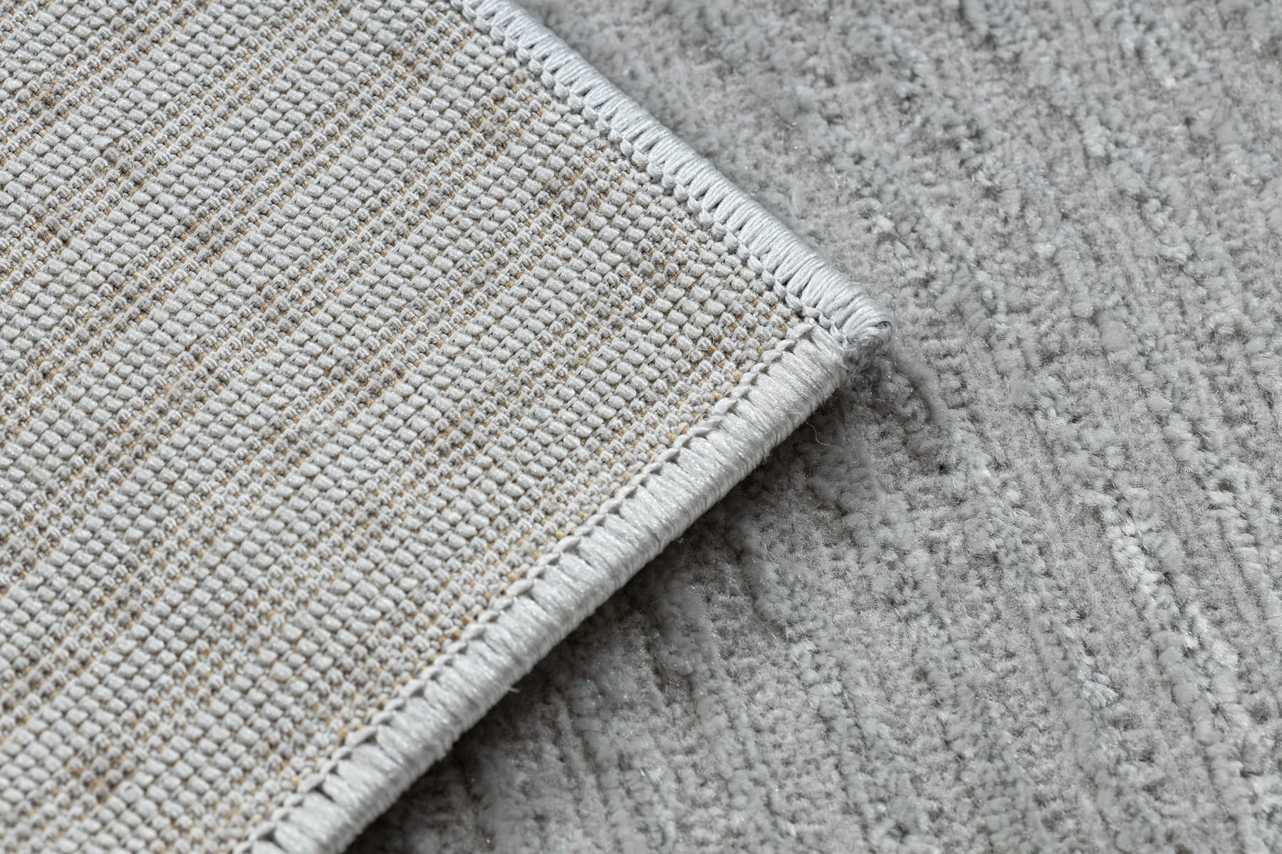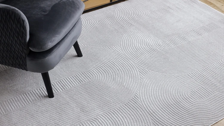 Szary dywan z geometrycznym wzorem, który doskonale wpisze się w nowoczesny salon lub pokój.