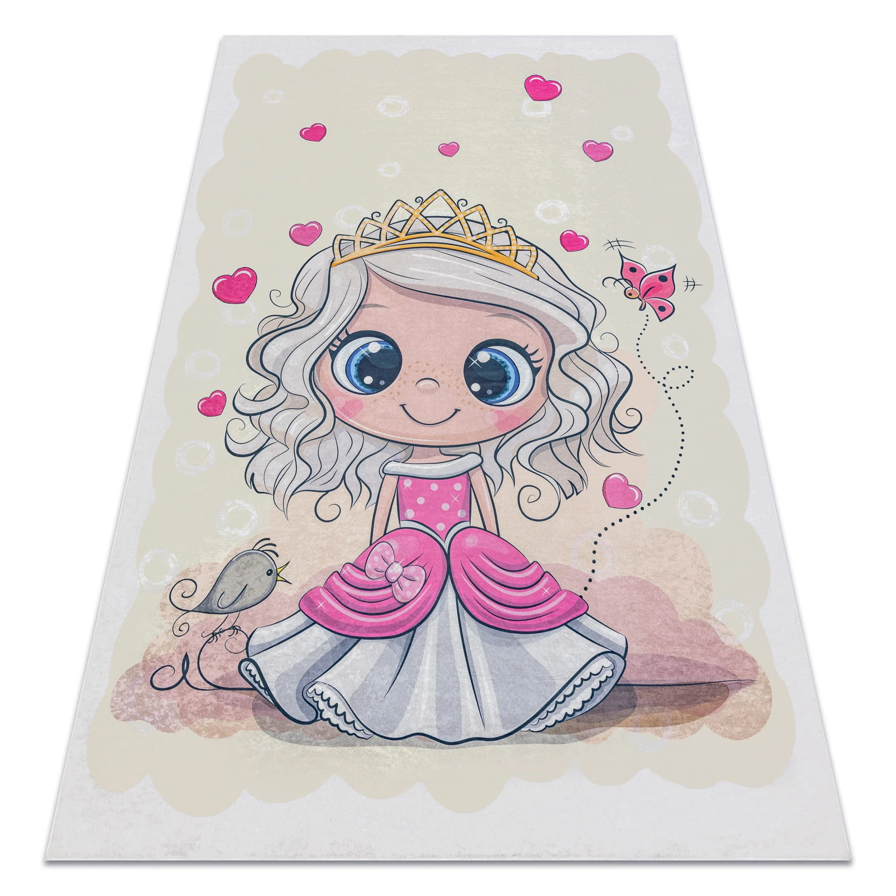 Kremowy dywan z motywem księżniczki, idealny do pokoju dziewczynki, gdzie stworzy bajkową atmosferę.
