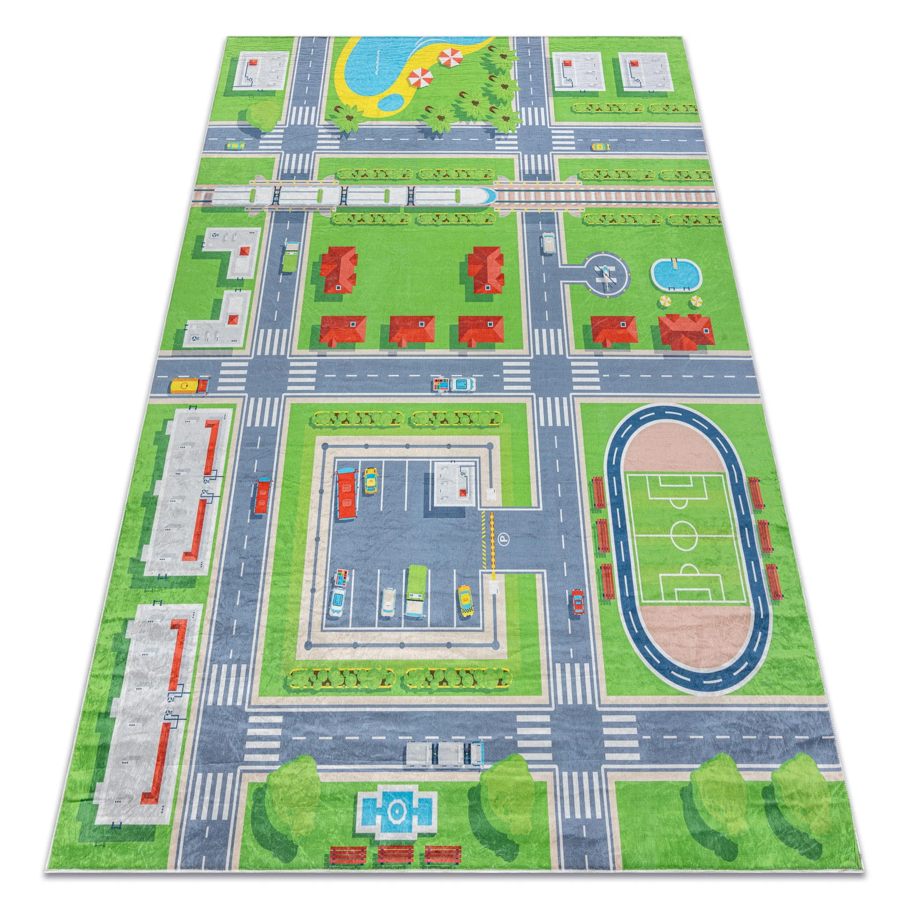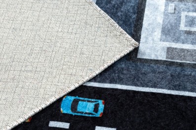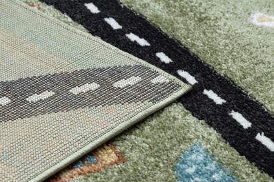 Szaro-zielony dywan z motywem miasta, który ożywi pokój dziecka i stworzy przestrzeń do kreatywnej zabawy.