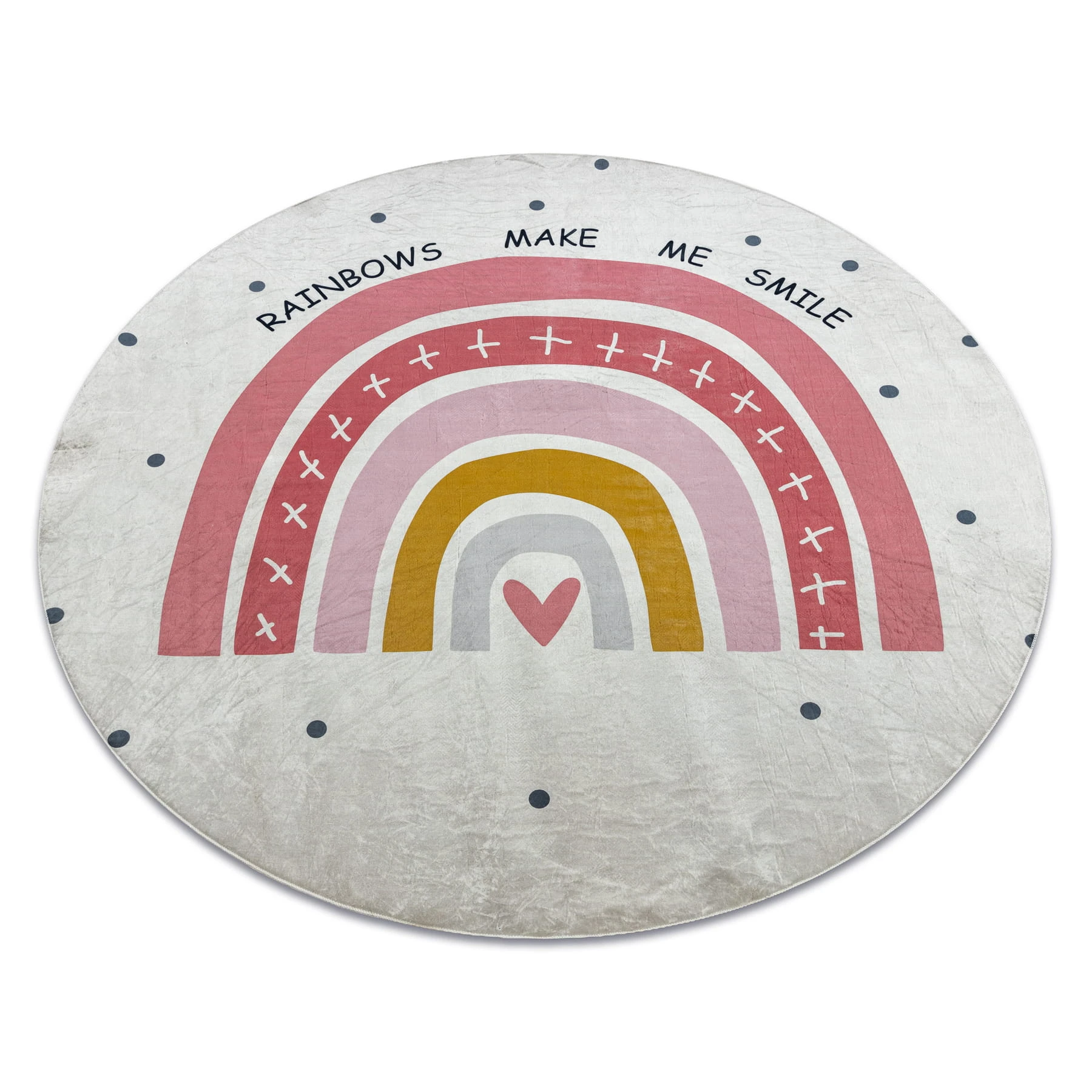 Różowy dywan z motywem tęczy, który ożywi pokój córki kolorowym akcentem i stworzy przestrzeń do zabawy.