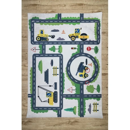 Kremowy dywan z motywem ulic i samochodów, który stworzy idealną przestrzeń do zabawy i zachęci do kreatywnych przygód.