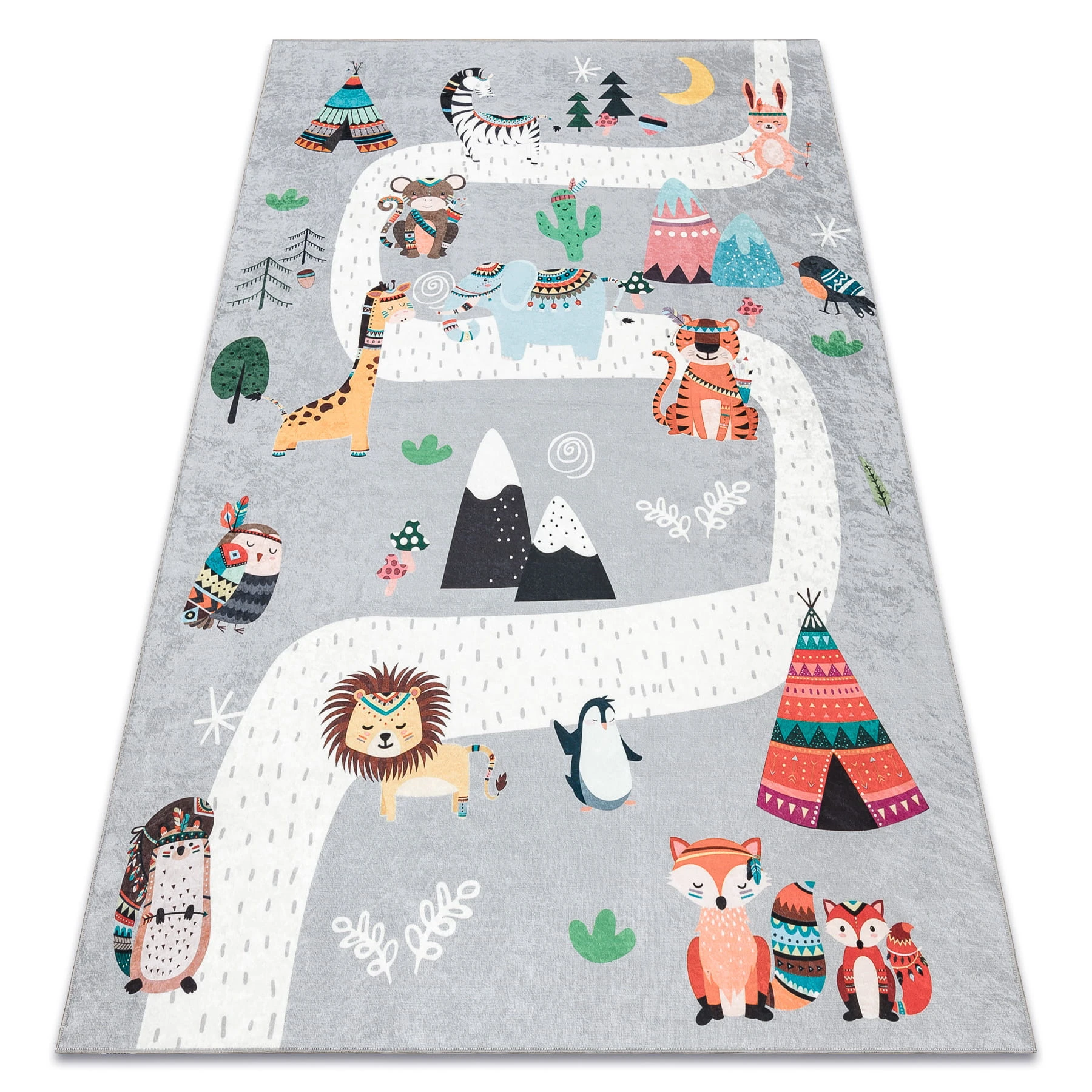 Szary dywan dziecięcy ze zwierzęcym wzorem, który zamieni pokój malucha w fascynującą krainę przygód.