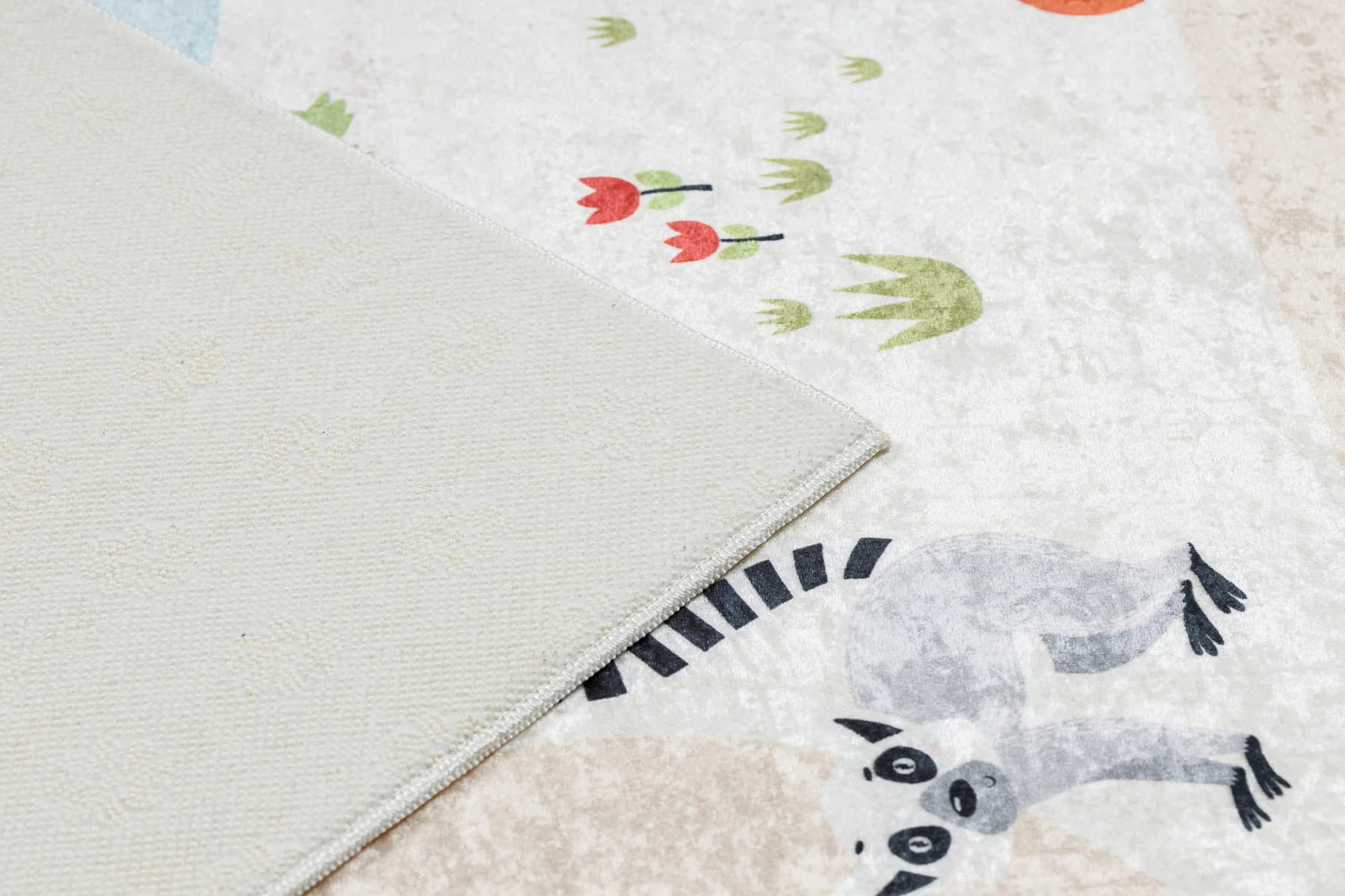 Beżowy dywan z wesołymi zwierzętami, który idealnie sprawdzi się w pokoju dziecka, tworząc przyjazną przestrzeń do zabawy.