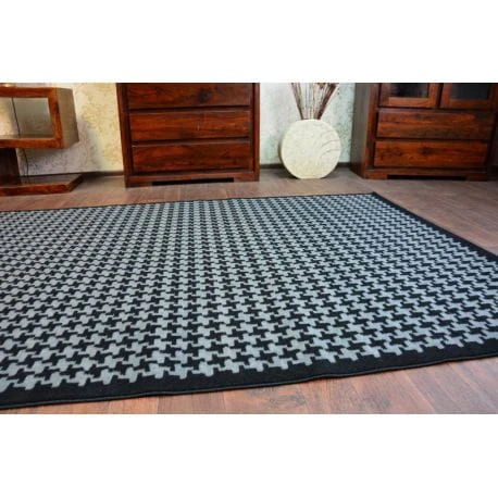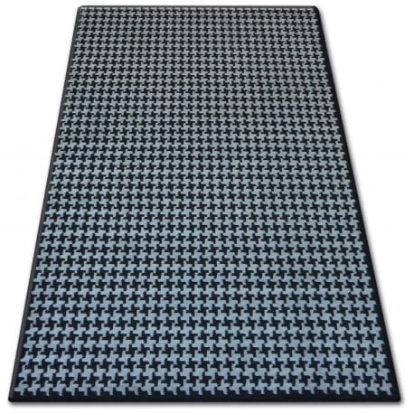 Niebieski dywan z geometrycznym wzorem, który wprowadzi do salonu nowoczesny akcent i ożywi wnętrze.