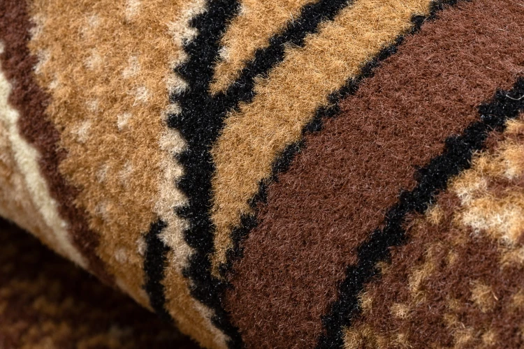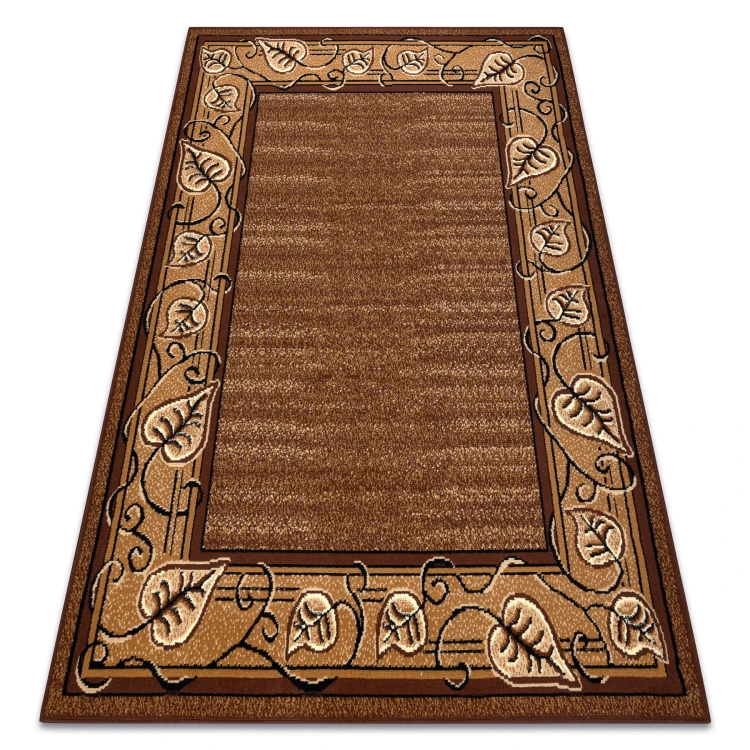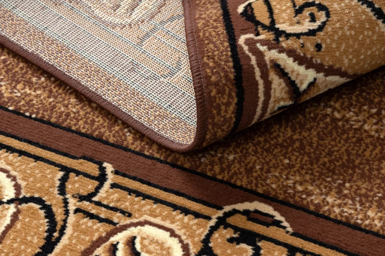 Brązowy dywan z tradycyjnym wzorem, który doskonale sprawdzi się w salonie, wprowadzając ciepły akcent do wnętrza.