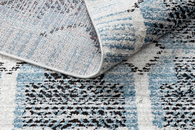 Beżowo-niebieski dywan z abstrakcyjnym wzorem, który wprowadzi do salonu spokojny, harmonijny akcent.