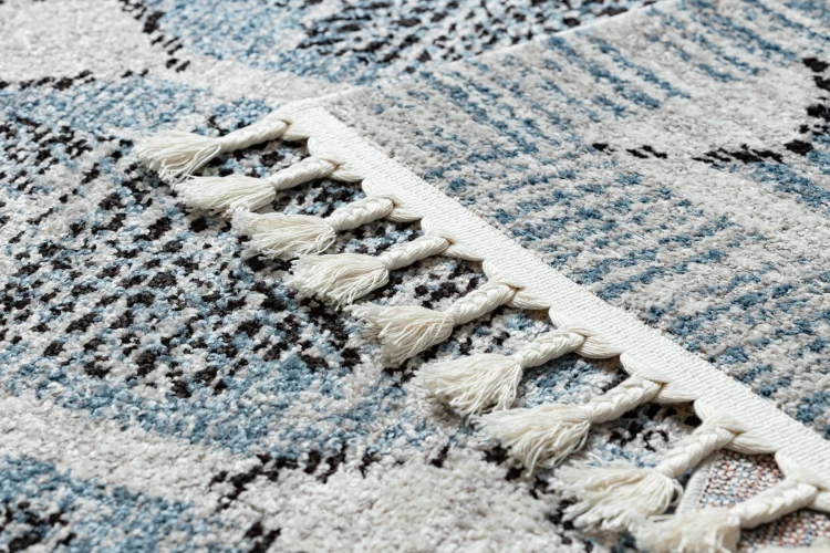 Beżowo-niebieski dywan z abstrakcyjnym wzorem, który wprowadzi do salonu spokojny, harmonijny akcent.