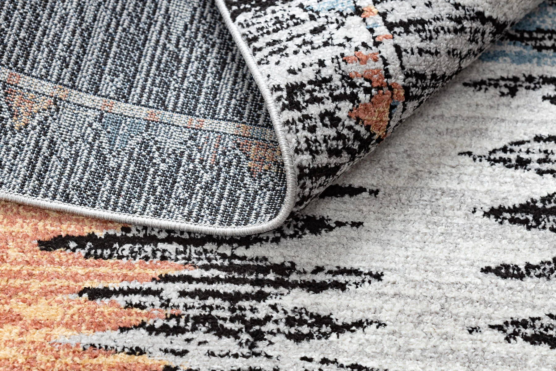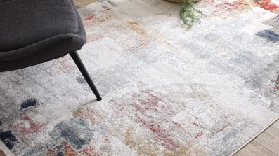 Wielokolorowy dywan z abstrakcyjnym wzorem, który doda salonowi nowoczesny charakter i energetyczny akcent.