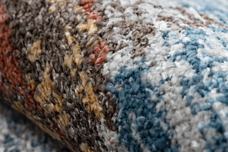 Niebieski dywan z abstrakcyjnym wzorem w beżowych akcentach, który doskonale wpisze się w nowoczesny salon.