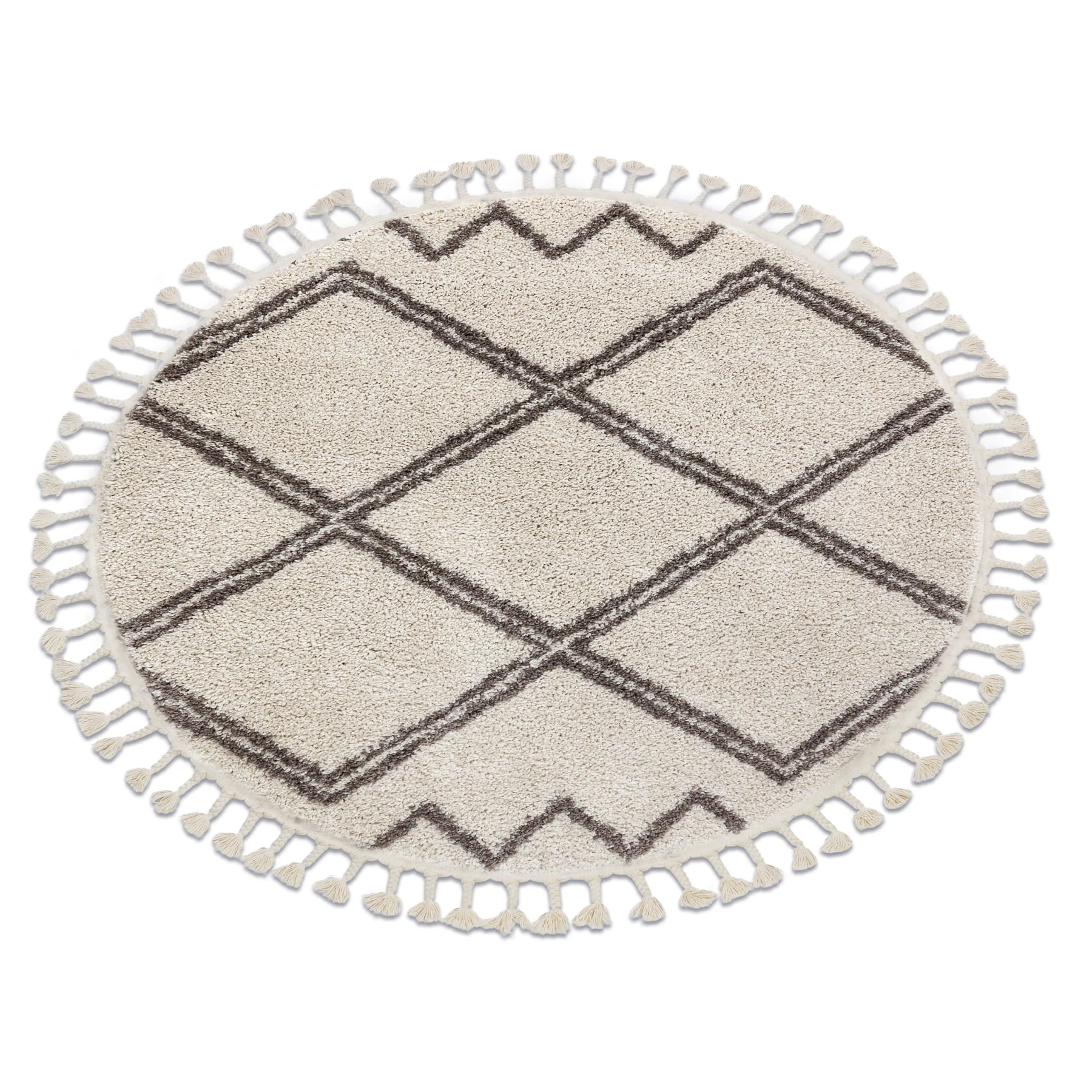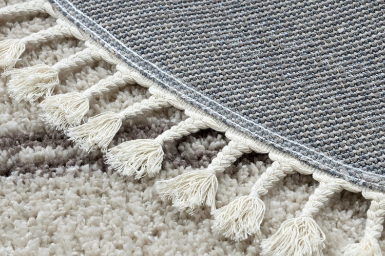 Okrągły dywan shaggy z runem 25 mm w beżowo-brązowej kolorystyce z marokańskim wzorem geometrycznym, który nada salonowi orientalny charakter.
