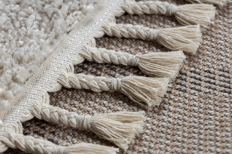 Kremowy dywan shaggy z runem 25 mm i tradycyjnym geometrycznym wzorem, który wprowadzi do salonu ciepłą, berberyjską atmosferę.