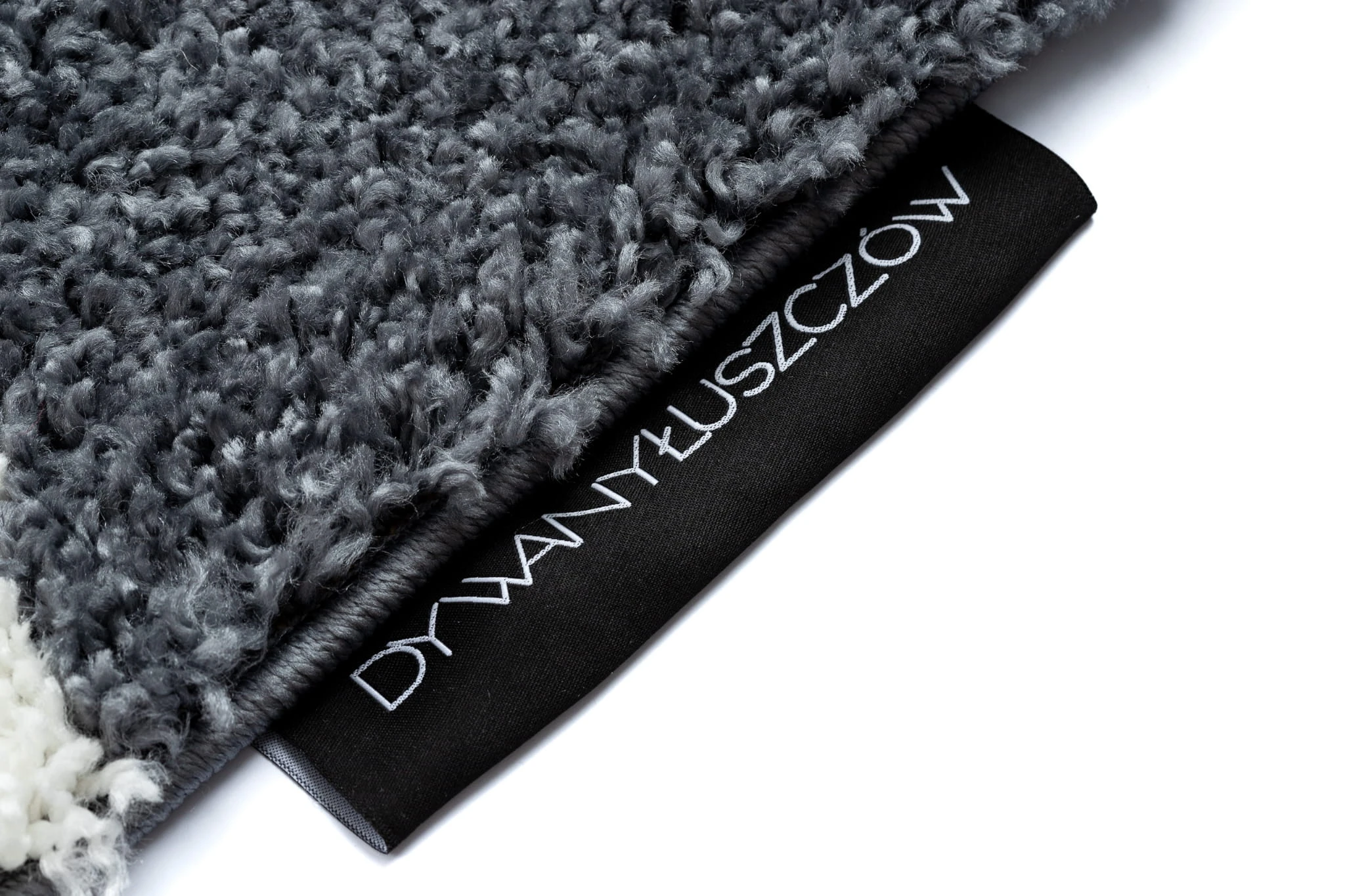 Szaro-biały dywan shaggy z runem 25 mm i geometrycznym wzorem w stylu berberyjskim, który doda salonowi charakterystyczny, etniczny akcent.