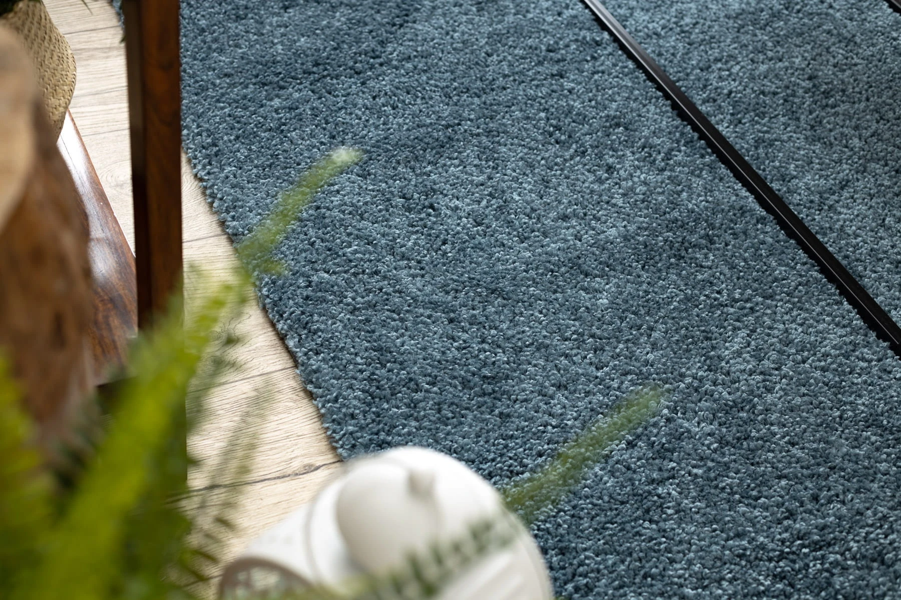 Niebieski dywan shaggy z runem 25 mm, który wprowadzi do wnętrza spokojną atmosferę i elegancki charakter.