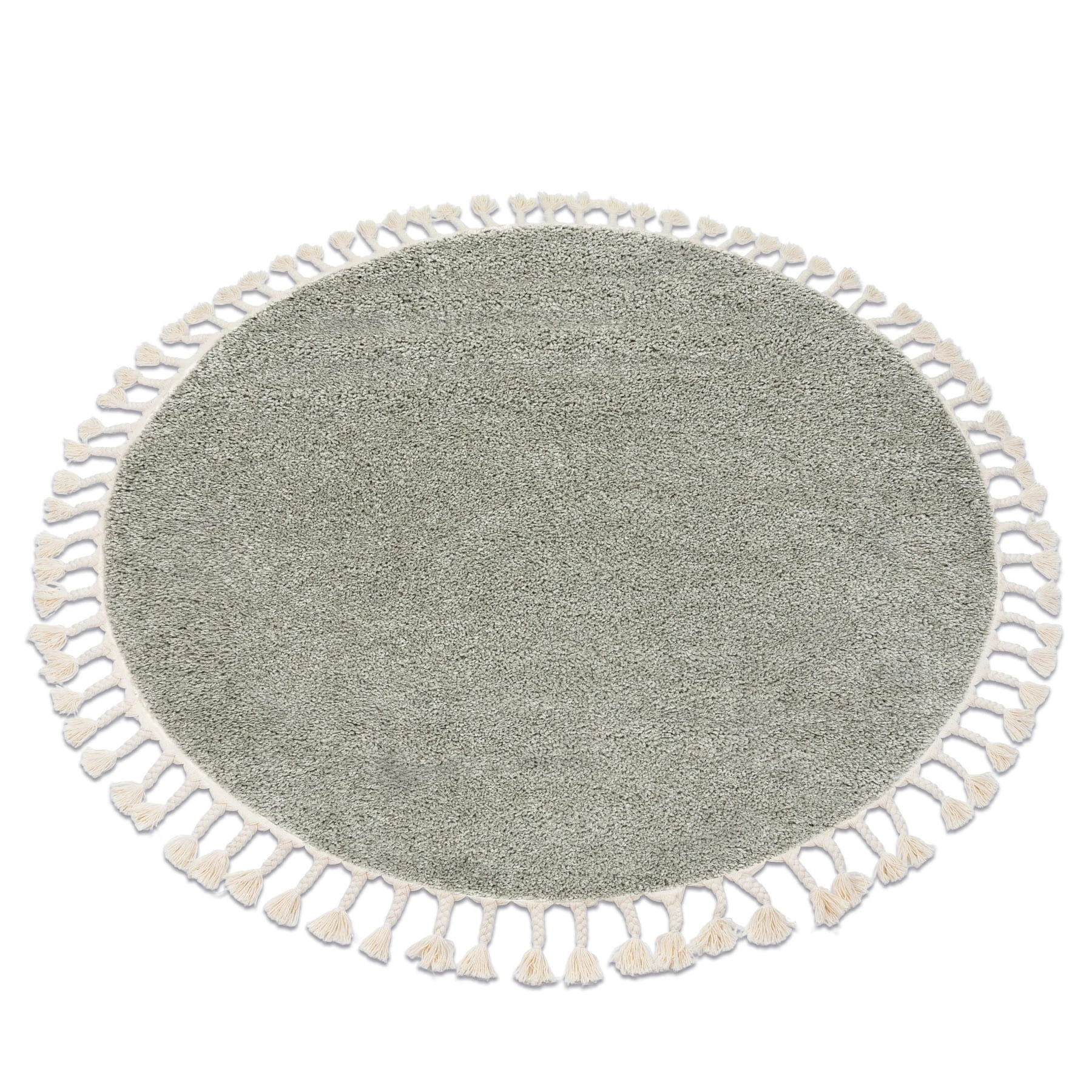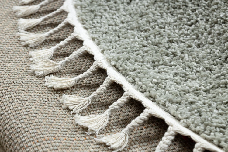 Okrągły zielony dywan shaggy z runem 25 mm w marokańskim stylu, który wprowadzi do salonu naturalny, uspokajający akcent.