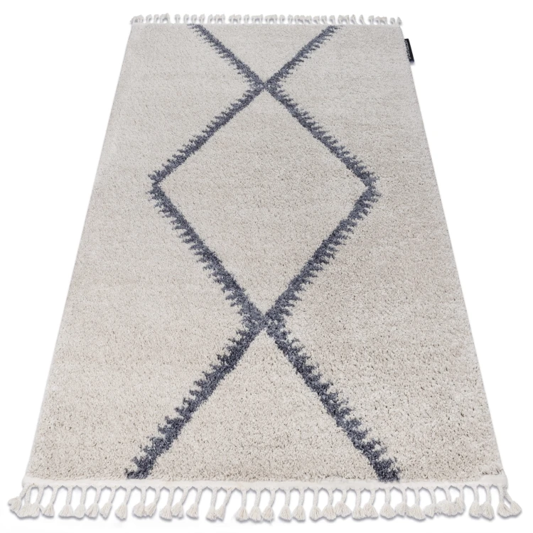 Szaro-kremowy dywan shaggy z runem 25 mm i geometrycznym wzorem, który wprowadzi do salonu orientalny klimat i przytulność.