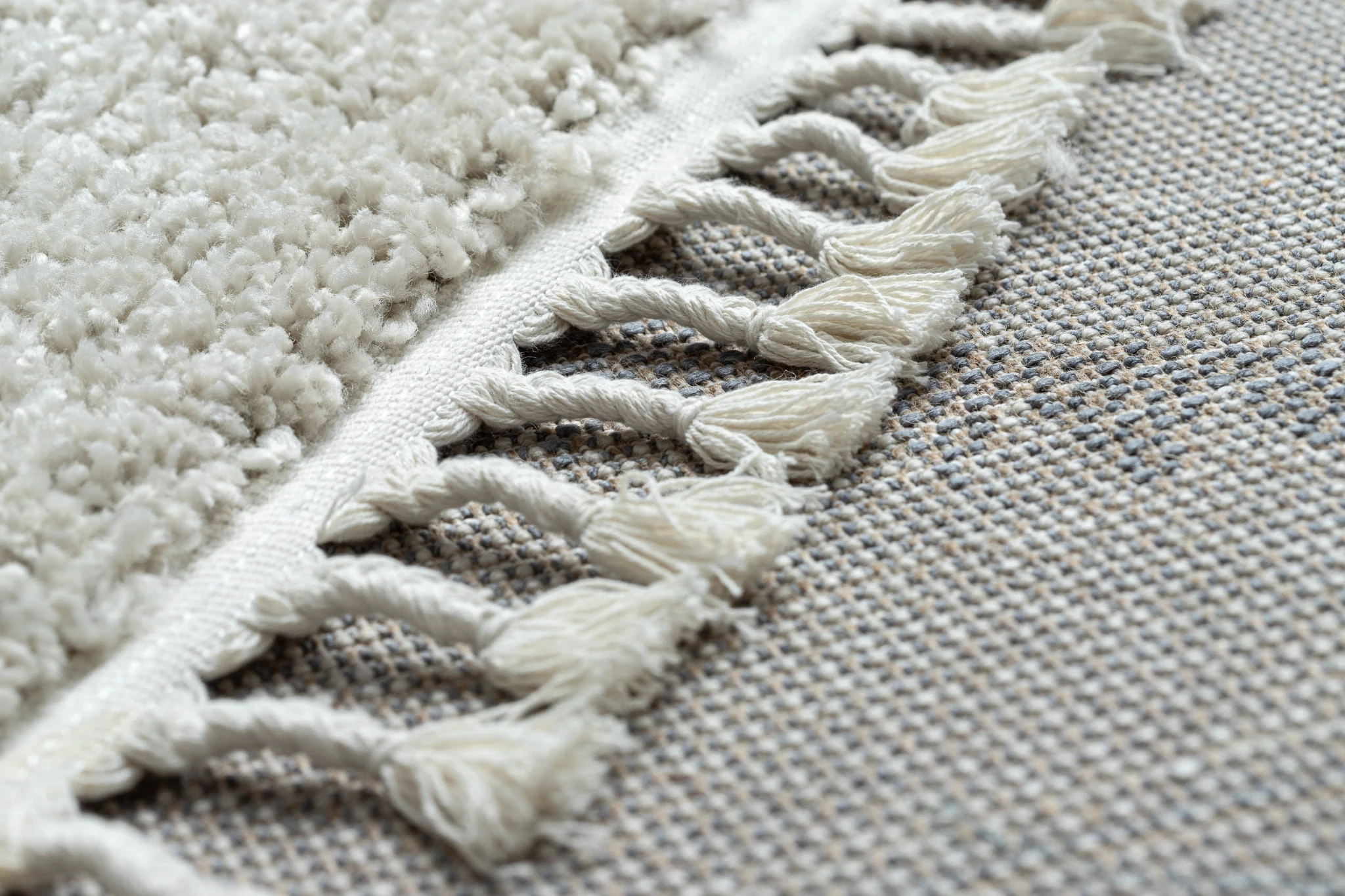 Szaro-kremowy dywan shaggy z runem 25 mm i geometrycznym wzorem, który wprowadzi do salonu orientalny klimat i przytulność.