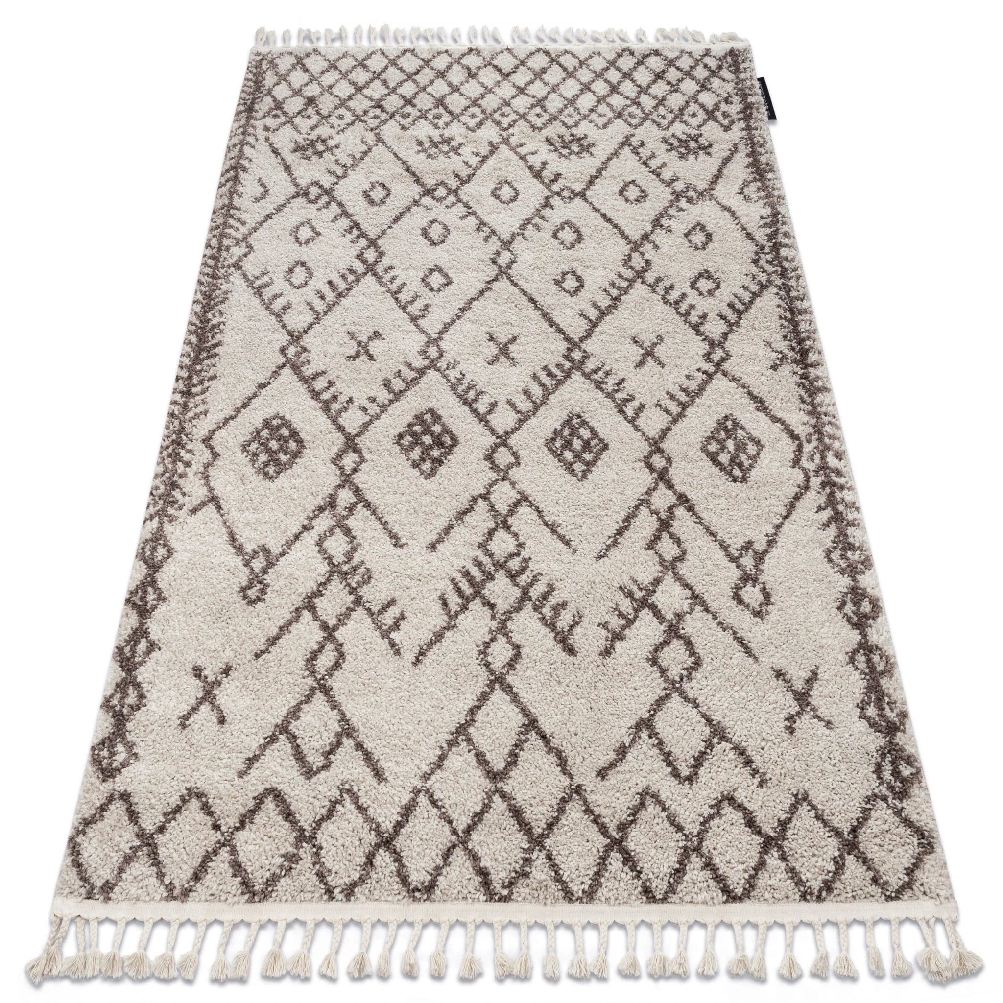 Beżowy dywan shaggy z runem 25 mm i tradycyjnym wzorem, który doskonale sprawdzi się w korytarzu, dodając mu ciepły, marokański charakter.