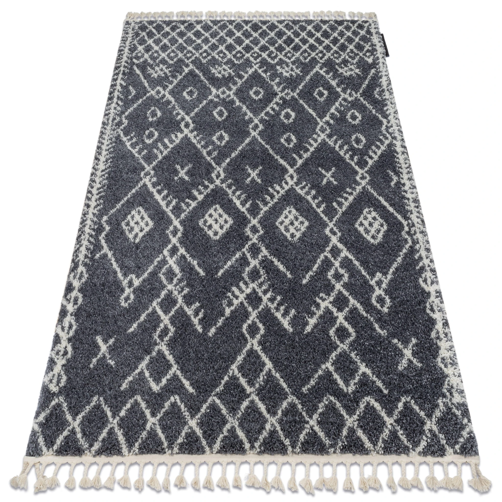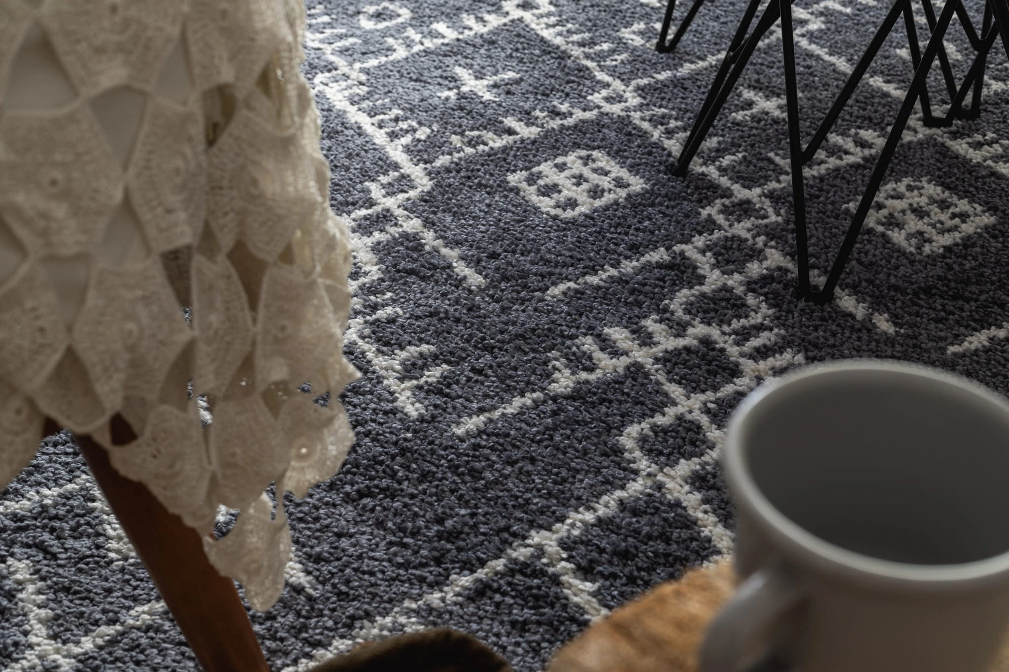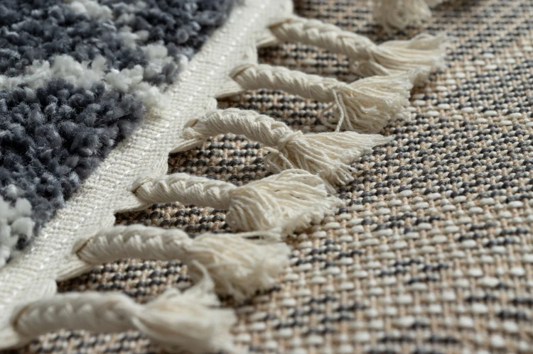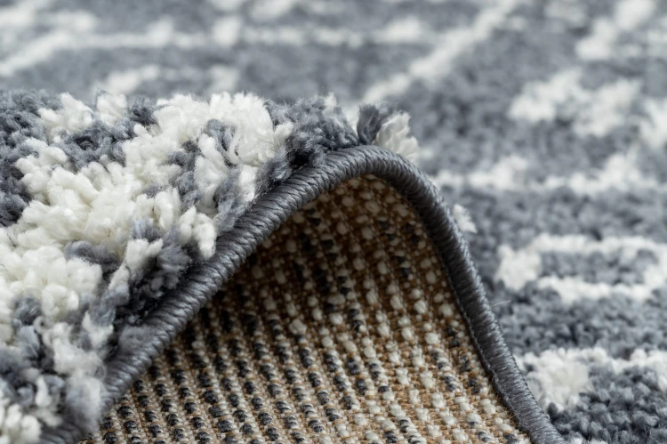Beżowy dywan shaggy z runem 25 mm i geometrycznym wzorem, który wprowadzi do salonu ciepłą atmosferę w marokańskim stylu.
