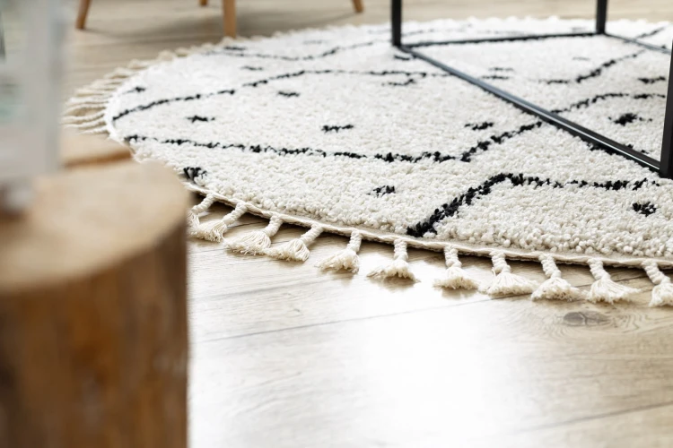 Kremowy dywan shaggy z runem 25 mm i berberyjskim wzorem zygzak, który doda salonowi ciepły, geometryczny akcent.