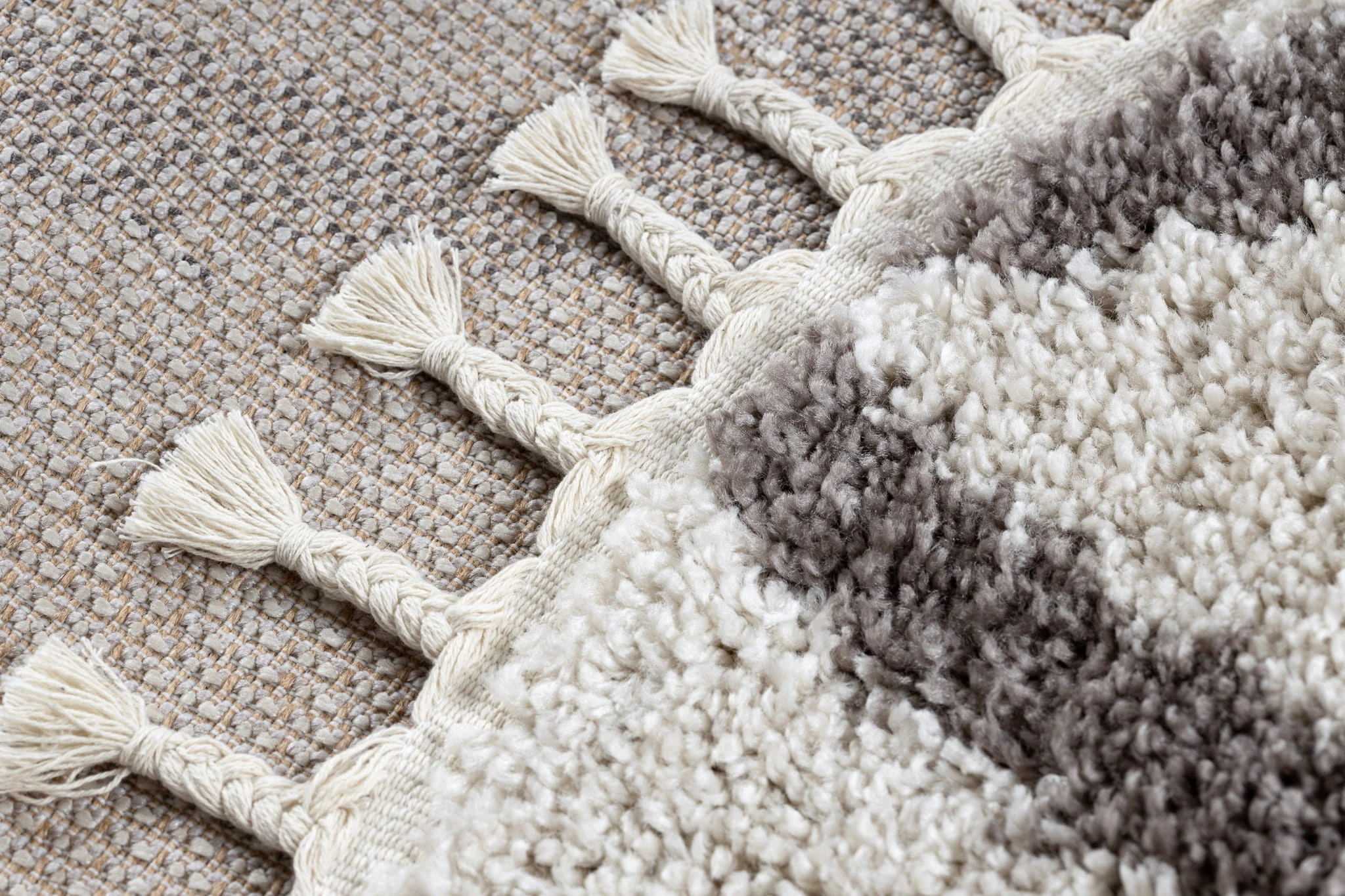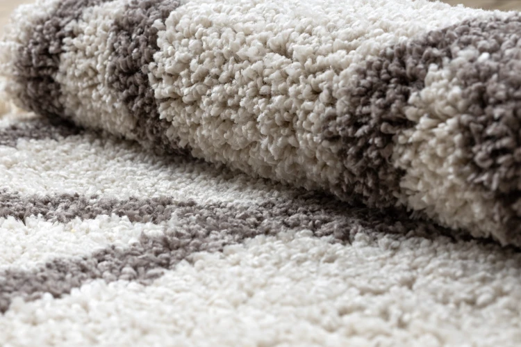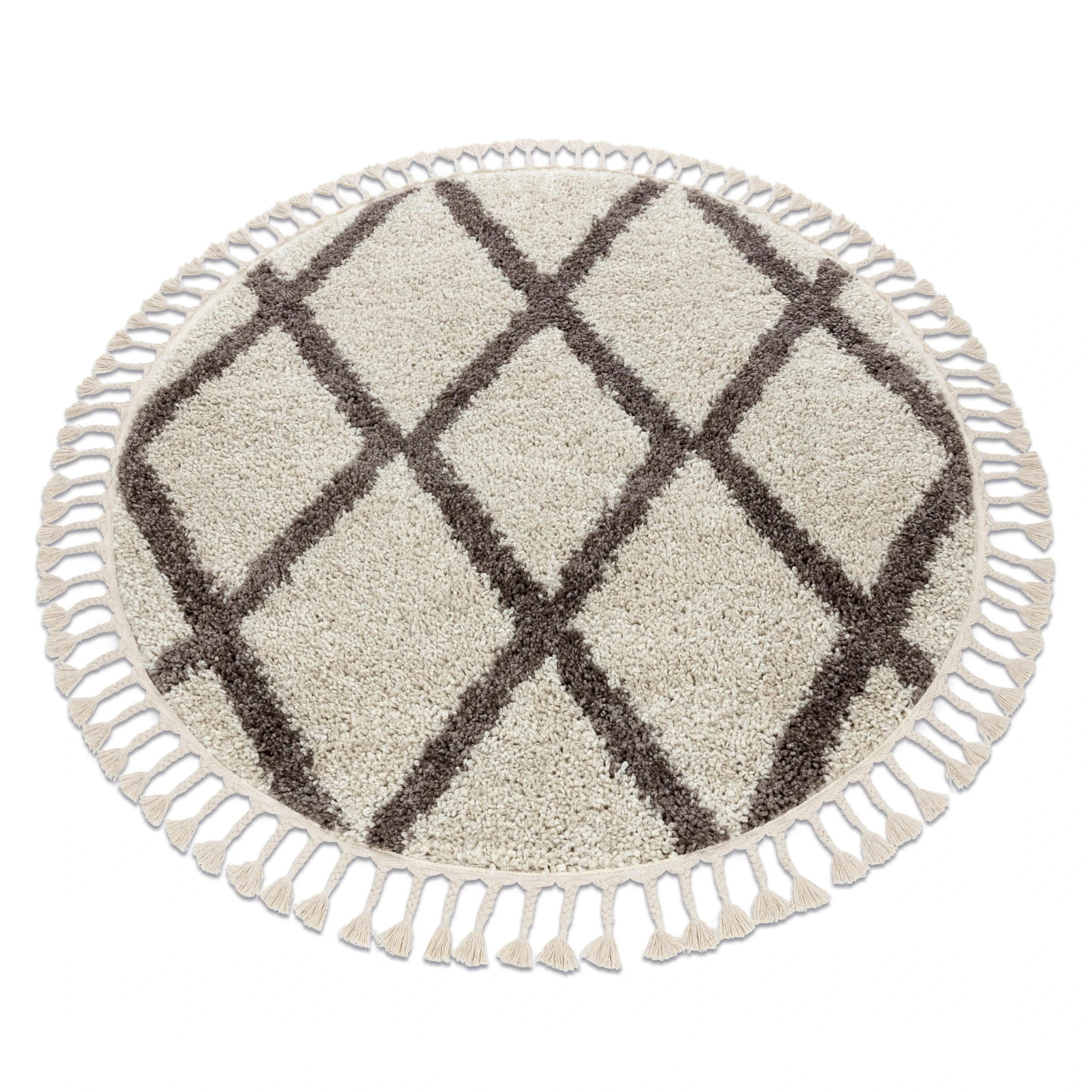 Okrągły kremowy dywan shaggy z runem 25 mm i tradycyjnym geometrycznym wzorem, który doda salonowi ciepły, przytulny charakter.
