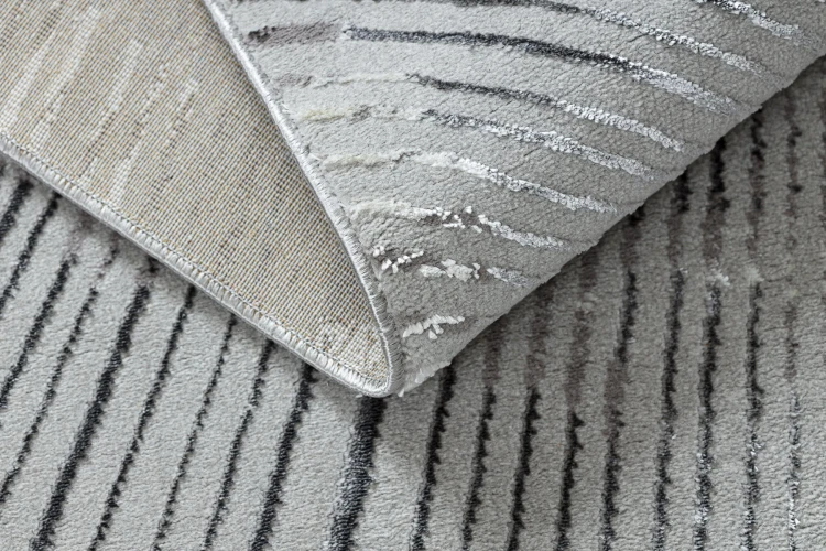 Szary dywan z abstrakcyjnym wzorem linii, który wprowadzi do salonu nowoczesny charakter.