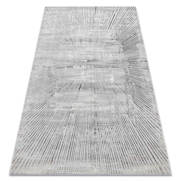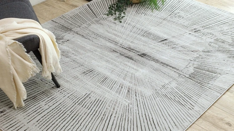 Szary dywan z abstrakcyjnym wzorem linii, który wprowadzi do salonu nowoczesny charakter.