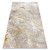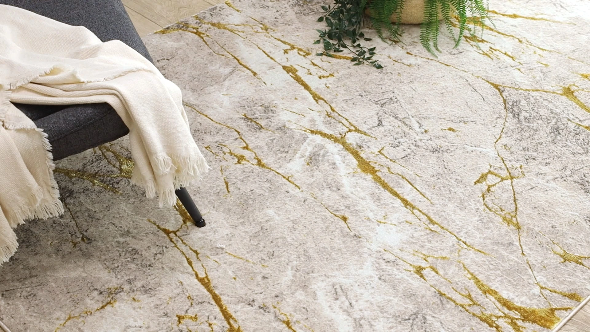 Beżowy dywan ze złotymi akcentami i abstrakcyjnym wzorem, który nada salonowi elegancki, nowoczesny charakter.