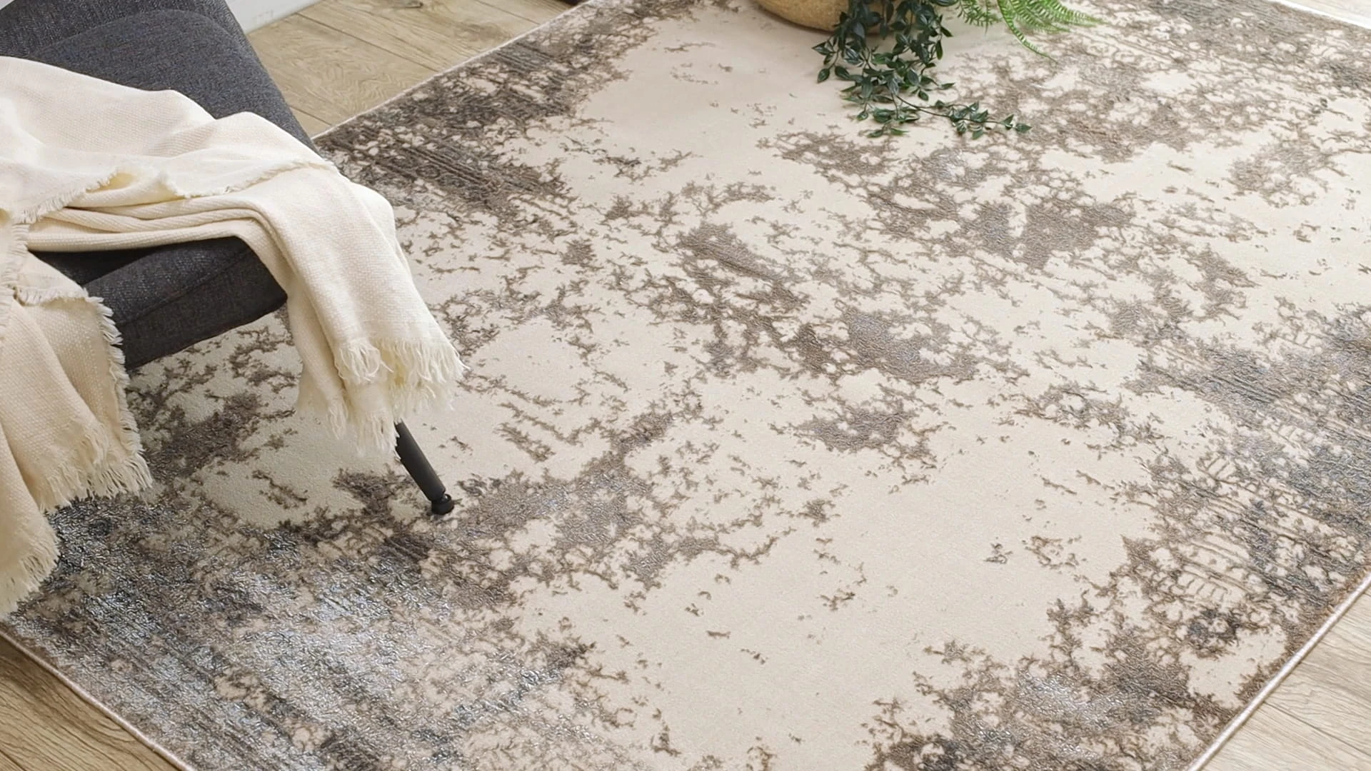 Beżowy dywan z abstrakcyjnym wzorem, który doskonale wpisze się w salon lub pokój, tworząc spokojną i harmonijną atmosferę.