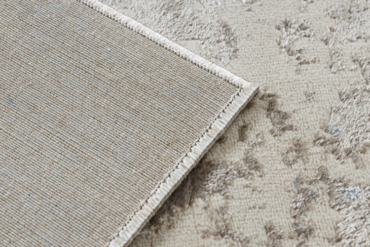 Beżowy dywan z abstrakcyjnym wzorem, który doskonale wpisze się w salon lub pokój, tworząc spokojną i harmonijną atmosferę.