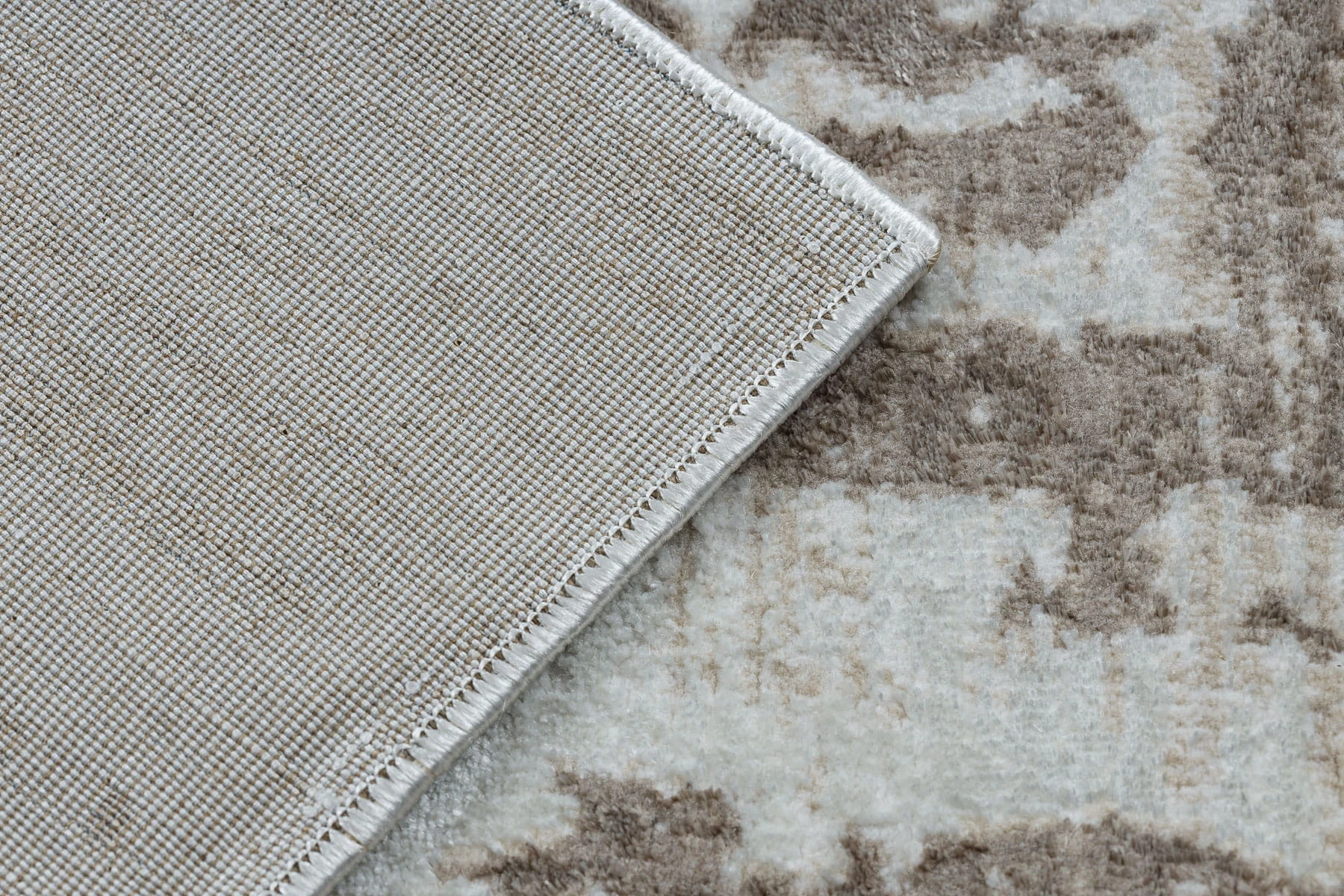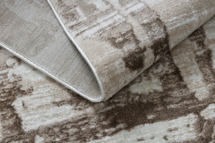 Beżowy dywan z abstrakcyjnym wzorem, który doskonale wypełni korytarz, nadając mu nowoczesny charakter.