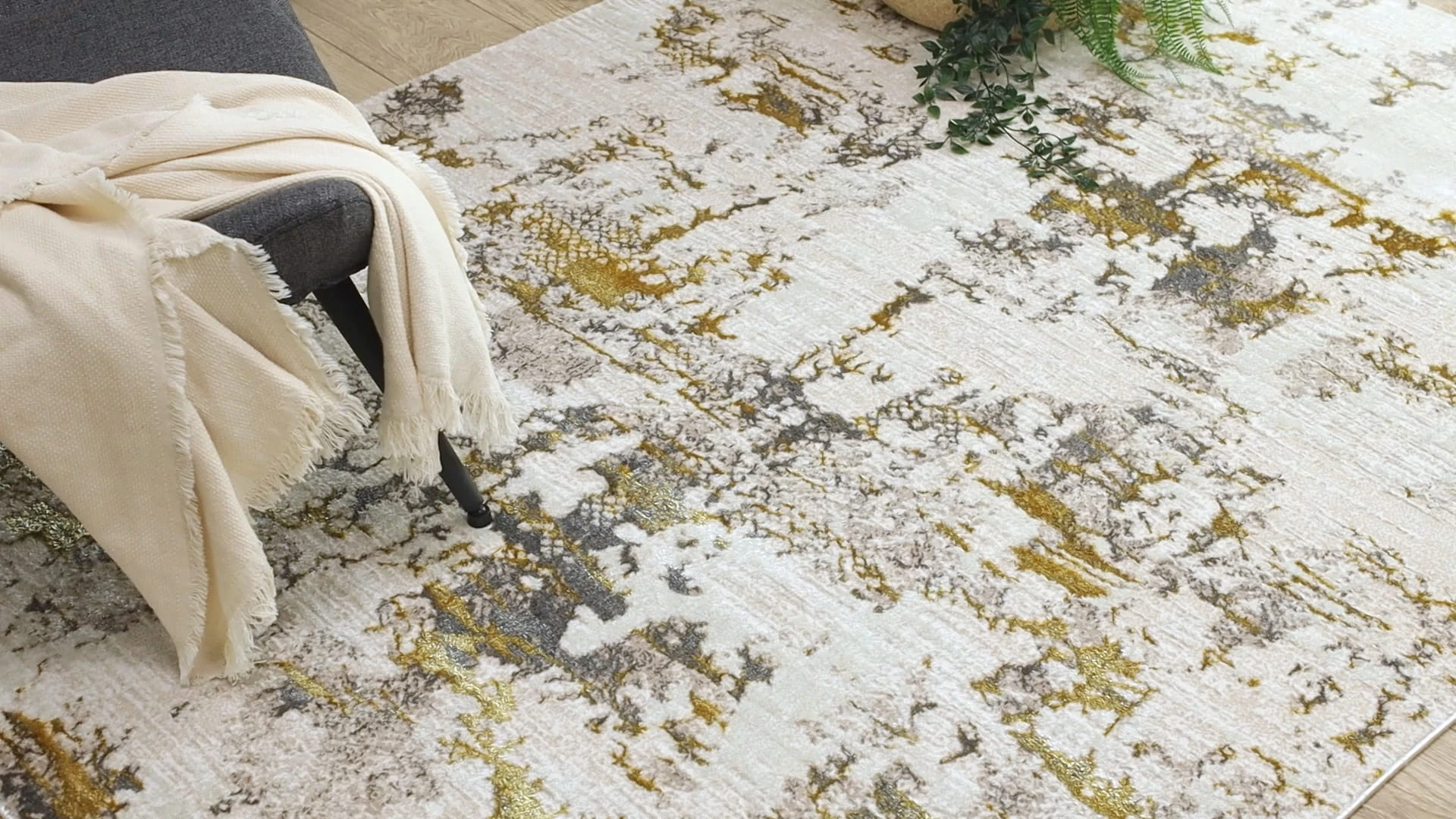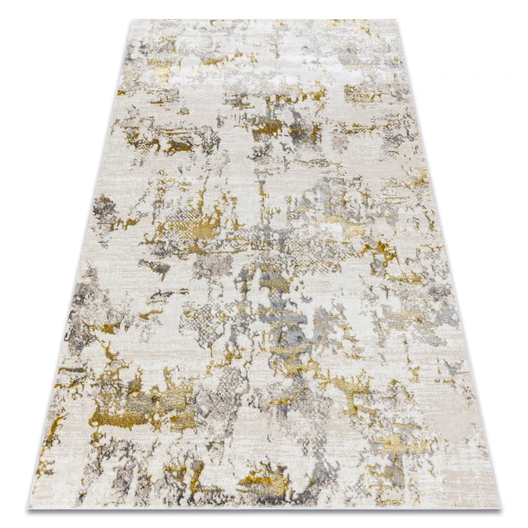 Kremowo-złoty dywan z abstrakcyjnym wzorem, który doda salonowi elegancki charakter i ciepłe, luksusowe akcenty.