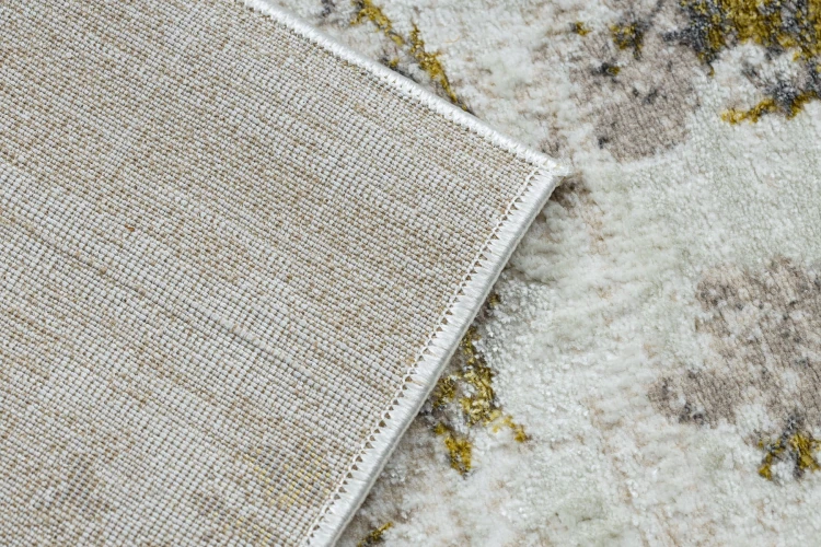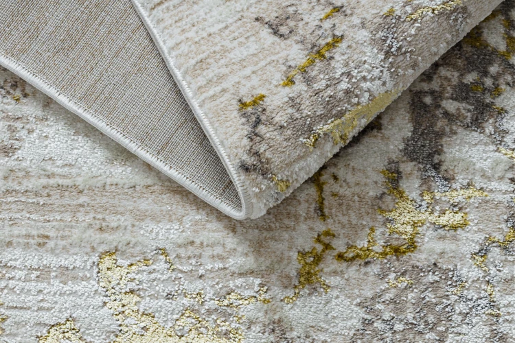 Kremowo-złoty dywan z abstrakcyjnym wzorem, który doda salonowi elegancki charakter i ciepłe, luksusowe akcenty.