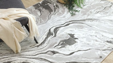 Szaro-różowy dywan z abstrakcyjnym wzorem, który wprowadzi do pokoju subtelny, kobiecy charakter.