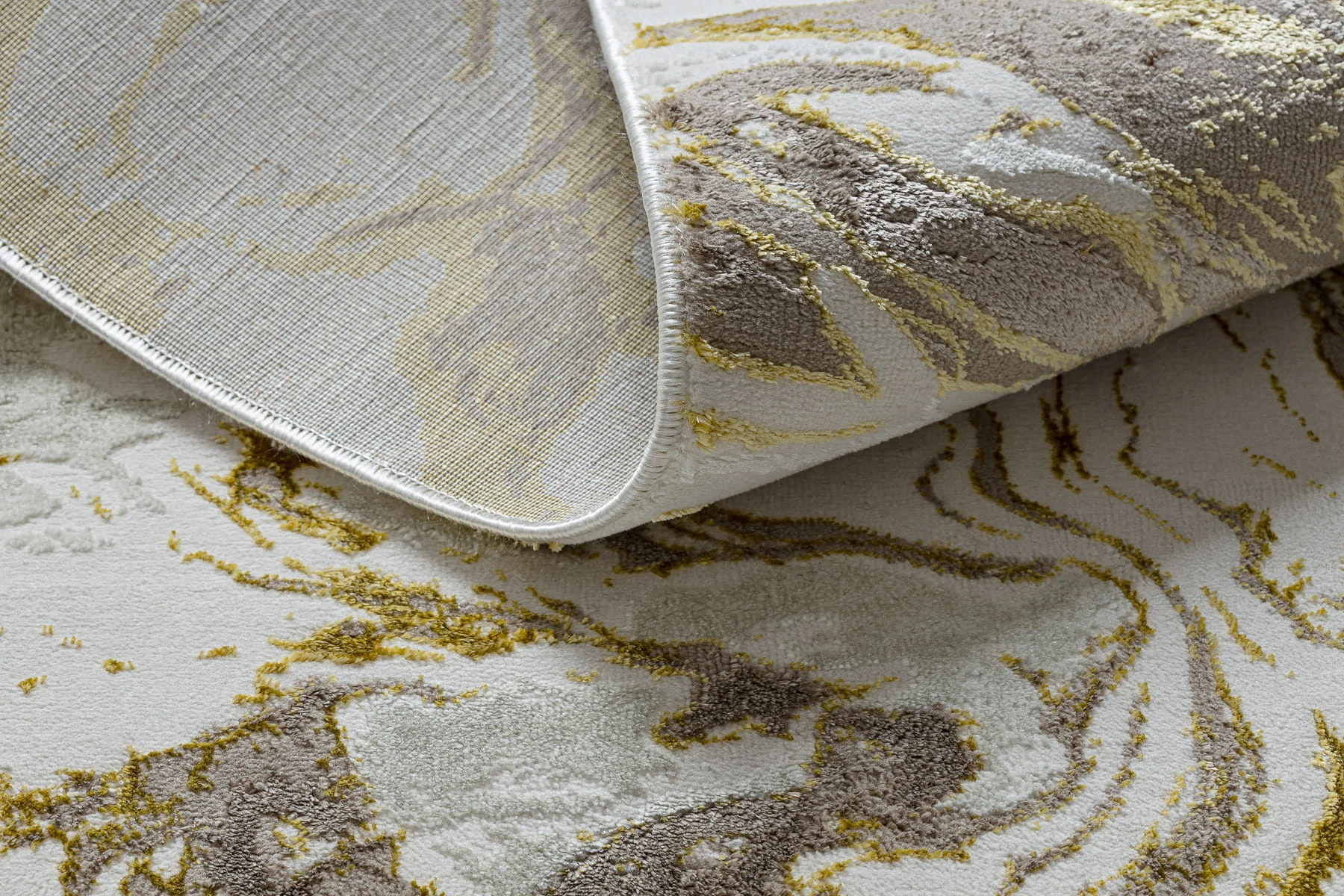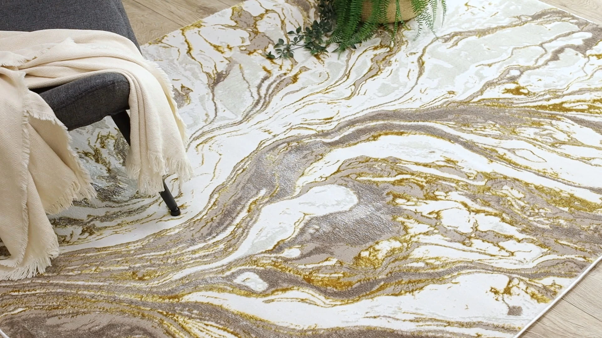 Złoto-kremowy dywan z abstrakcyjnym wzorem, który wprowadzi do wnętrza ciepły, elegancki akcent.