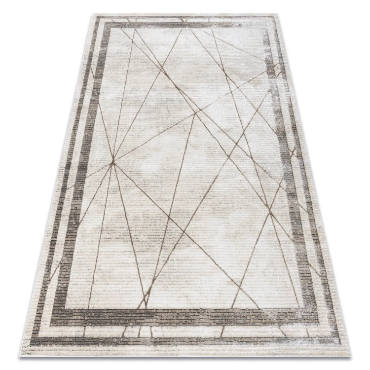 Beżowy dywan z geometrycznym wzorem ramki, który doskonale sprawdzi się w salonie lub pokoju, nadając wnętrzu subtelny charakter.