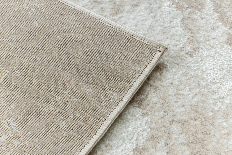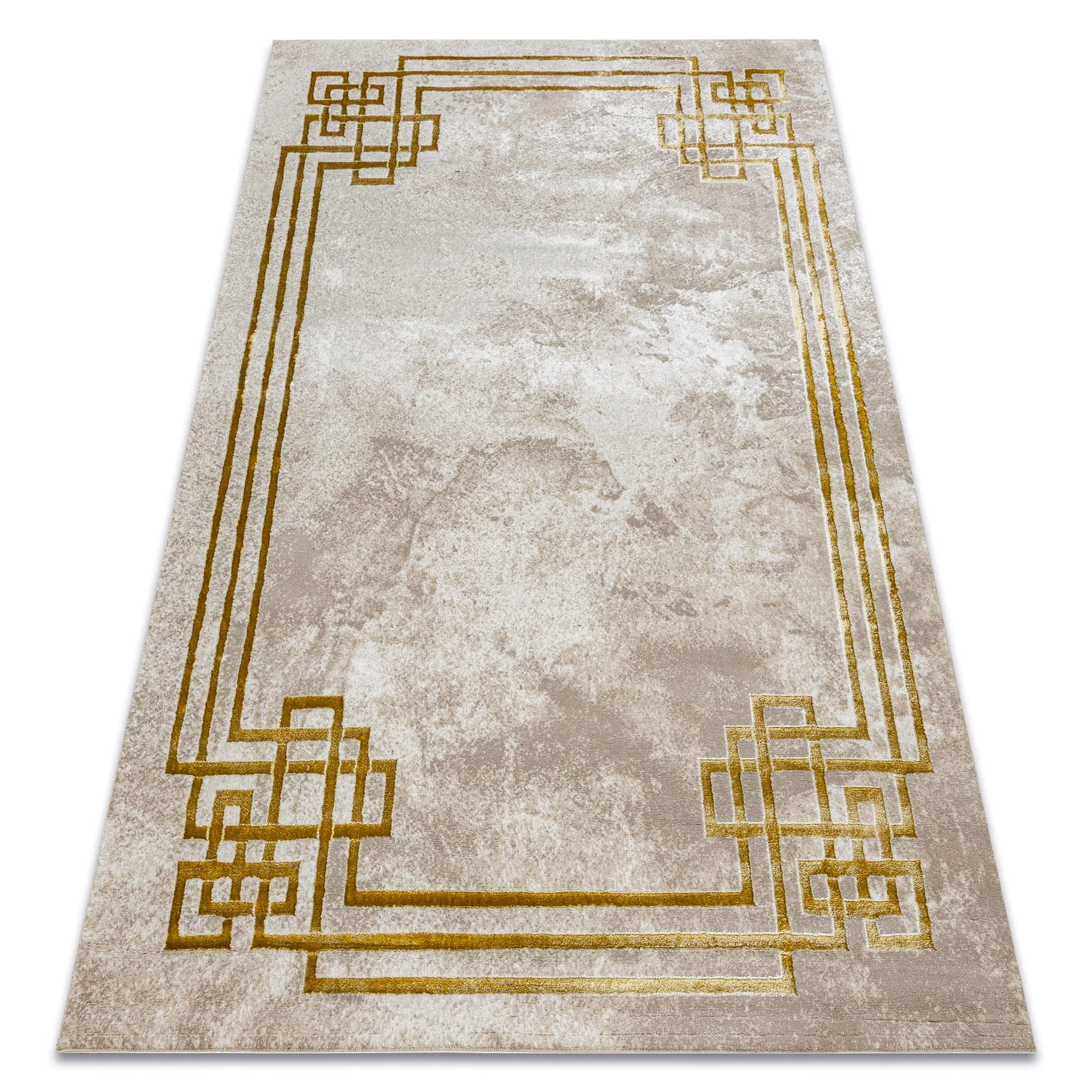 Kremowy dywan z grecką ramką w złotym odcieniu, który doda salonowi klasycznego charakteru i ponadczasowej elegancji.