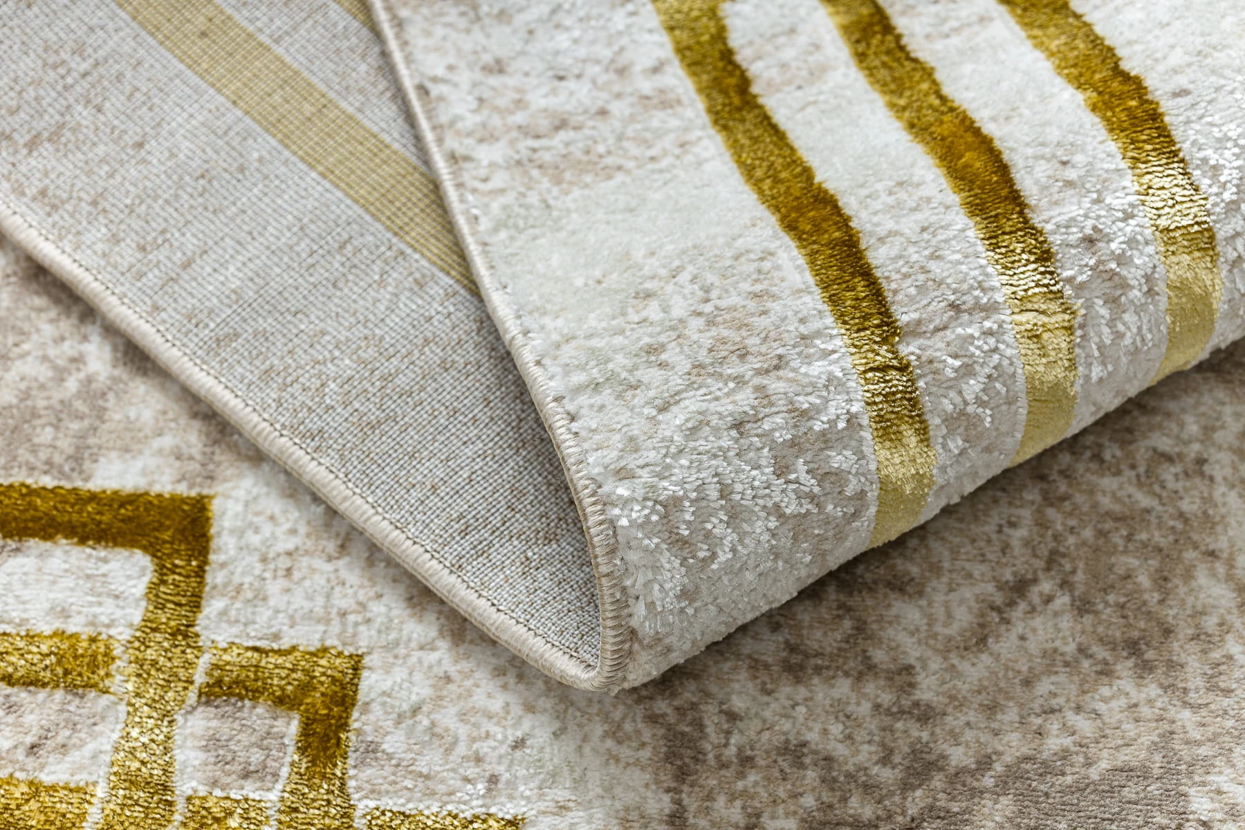 Kremowy dywan z grecką ramką w złotym odcieniu, który doda salonowi klasycznego charakteru i ponadczasowej elegancji.