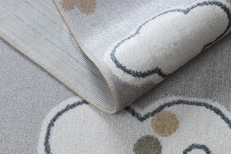 Kremowo-szary dywan z motywem chmurek, który subtelnie ożywi pokój dziecka i stworzy spokojną atmosferę do zabawy.