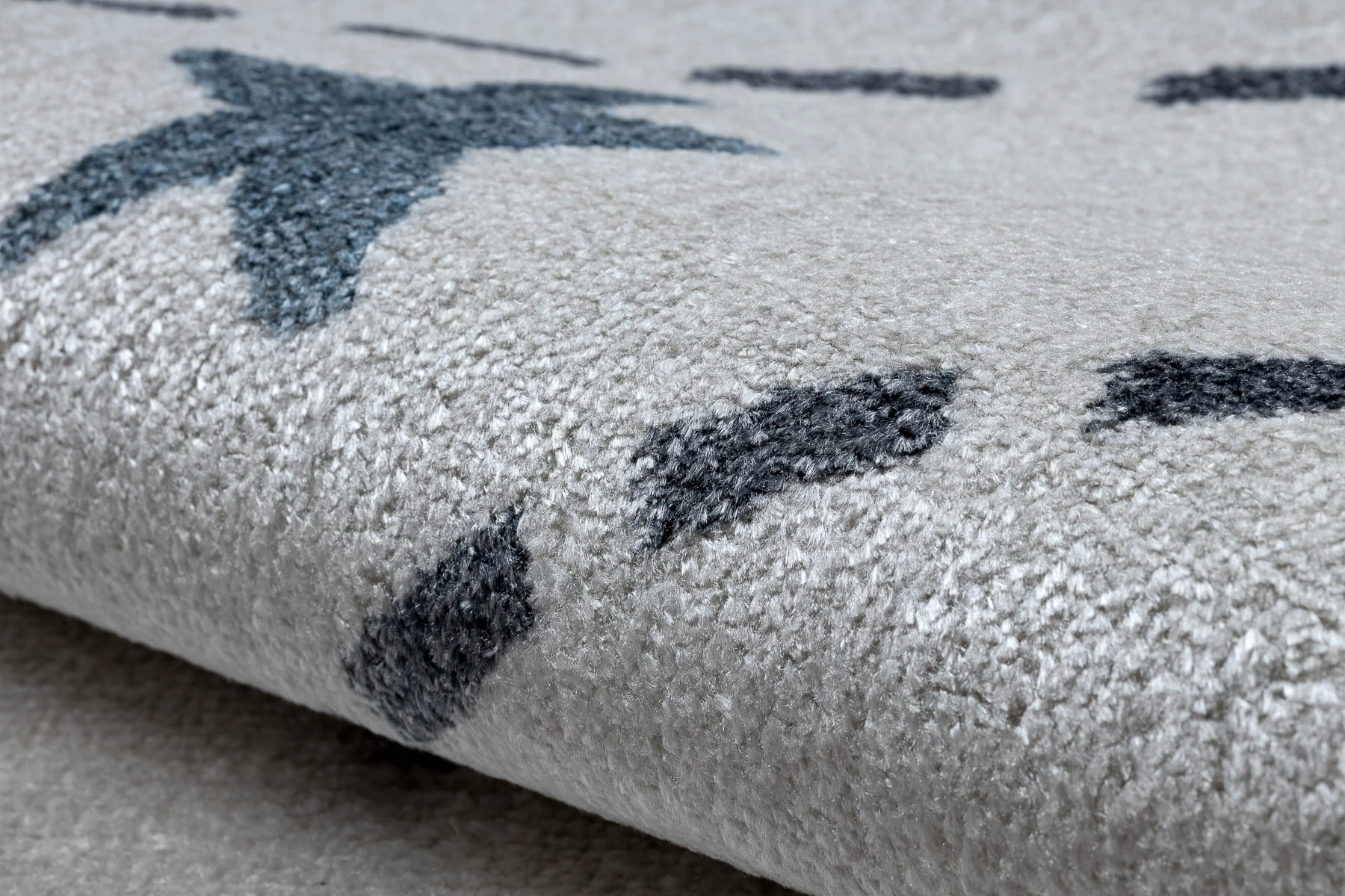 Szaro-kremowy dywan z abstrakcyjnym wzorem kosmicznym, który idealnie sprawdzi się w pokoju dziecka, stymulując wyobraźnię i dodając wnętrzu nowoczesnego charakteru.