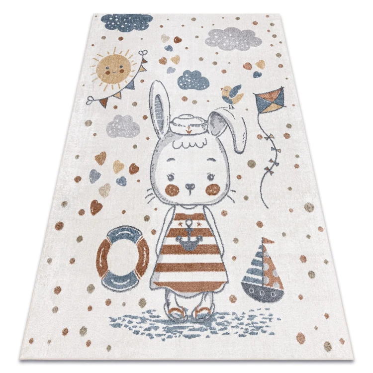 Kremowy dywan z motywem króliczka, który nada pokojowi dziecka ciepły, radosny charakter i stworzy przestrzeń do zabawy.