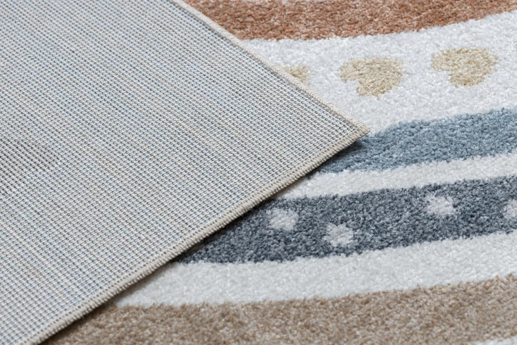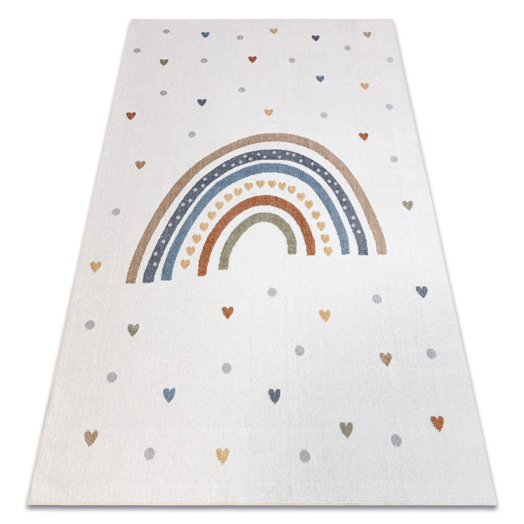 Kremowy dywan z motywem tęczy, który ożywi pokój dziecka kolorowymi akcentami i stworzy radosną atmosferę do zabawy.
