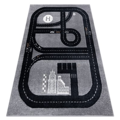 Szary dywan z motywem ulicy, który stworzy przestrzeń do zabawy i zachęci dziecko do kreatywnych przygód.