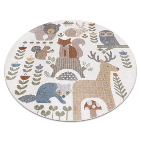 Kremowy dywan z motywem zwierząt leśnych, który ożywi pokój dziecka i stworzy przyjazną przestrzeń do zabawy.
