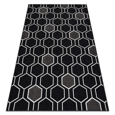 Czarno-szary dywan z geometrycznym wzorem, który doda salonowi nowoczesny charakter i eleganckość.