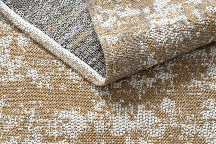 Dywan w odcieniach kremu i żółci, odporny na warunki atmosferyczne, idealny na taras i balkon.