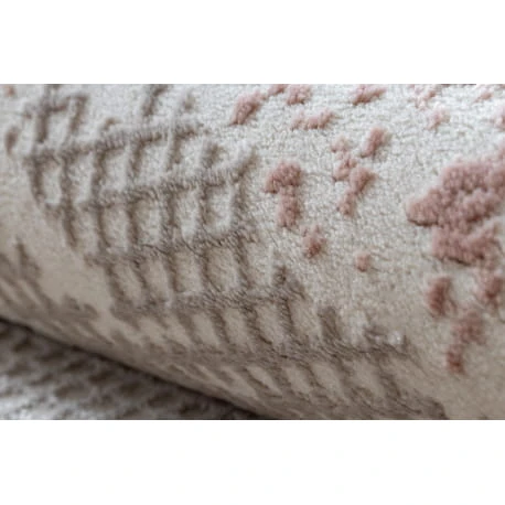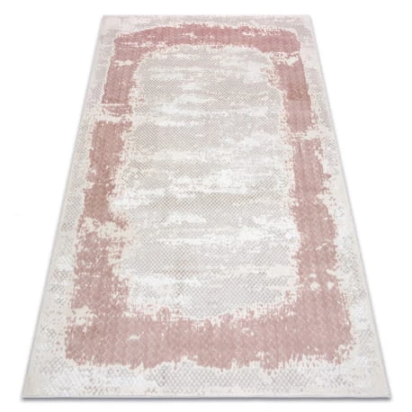 Beżowy dywan z delikatną różową ramką, który doskonale sprawdzi się w salonie, dodając wnętrzu subtelnego charakteru.