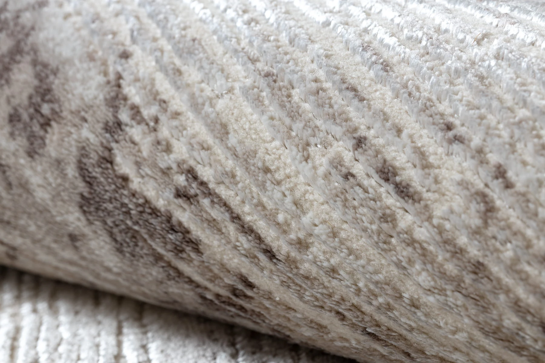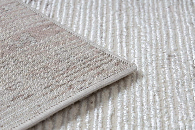 Beżowy dywan z delikatną ramką, który elegancko wyznacza przestrzeń korytarza w stonowanym stylu.