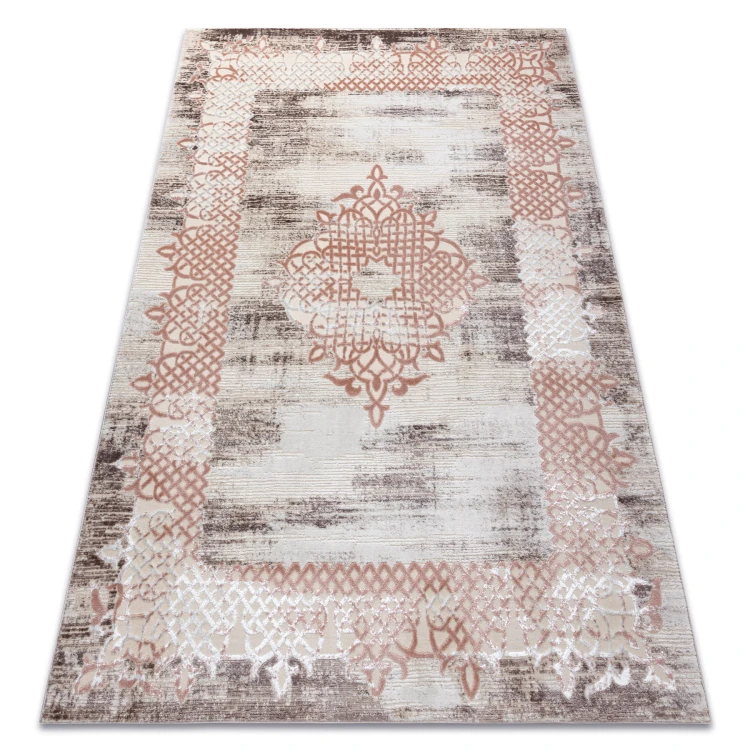 Beżowy dywan z delikatną różową ramką, który doda wnętrzu subtelności i ciepła.