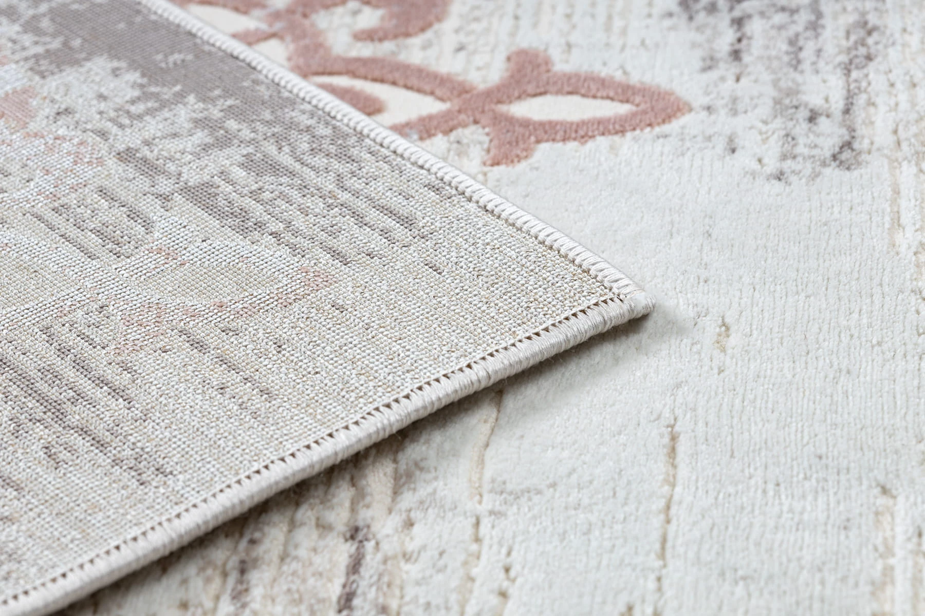 Beżowy dywan z delikatną różową ramką, który elegancko ozdobi korytarz subtelnym, ciepłym akcentem.